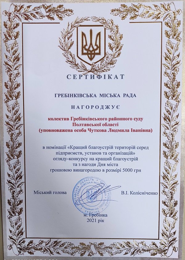 За спільним рішенням колективу суду вся сума грошової винаороди буде спрямована на покращення благоустрою Гребінківського районного суду Полтавської області.